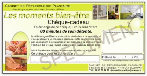 A offrir ou à s'offrir : Les chèques Cadeau - Moments de Bien être Offrez un moment de détente à vos proches, un cadeau personnel qui fait forcément plaisir. Consultez nous pour une information complète Cabinet de Réflexologie Plantaire 5 boulevard de la République - 44110 CHÂTEAUBRIANT Tél : 06 06 79 32 77 - jannault.claudine@orange.fr Contactez-nous !